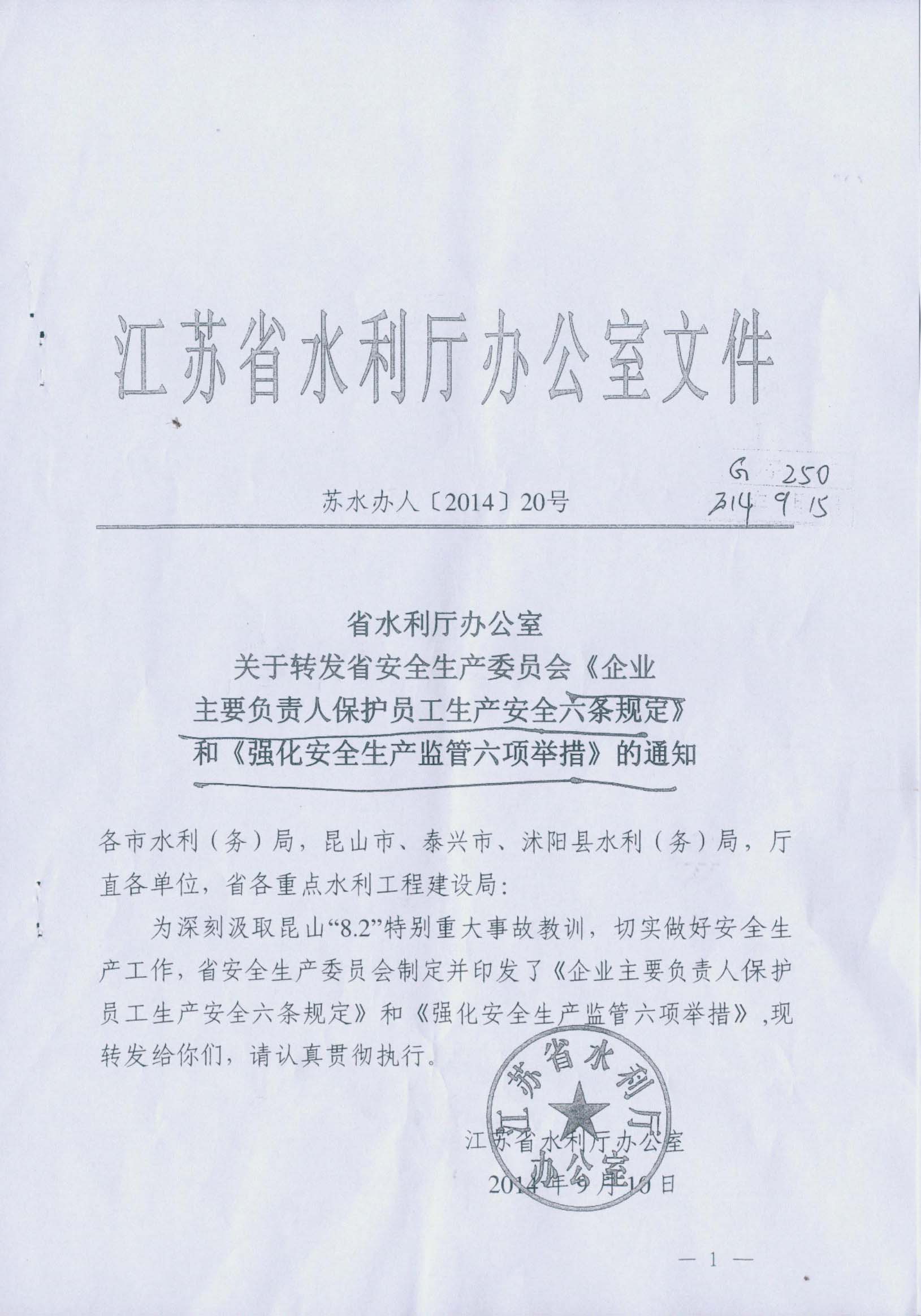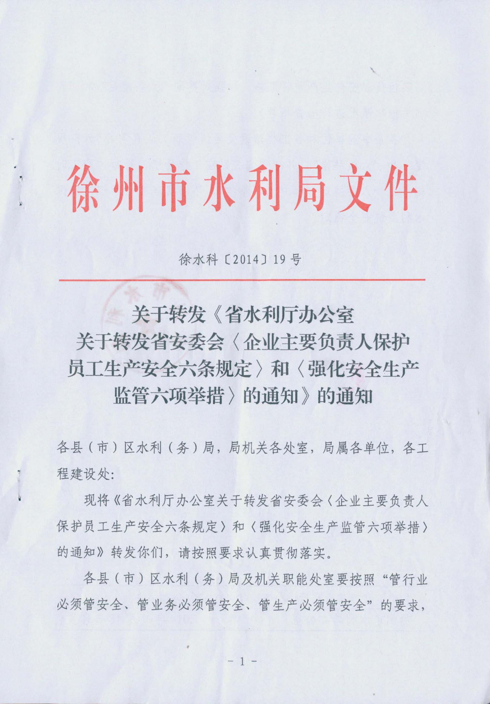 附件:《关于转发省安委会<企业主要负责人保护员工生产安全六项规定>和<强化安全生产监管六项举措>的通知》(徐水科[2014]19号)