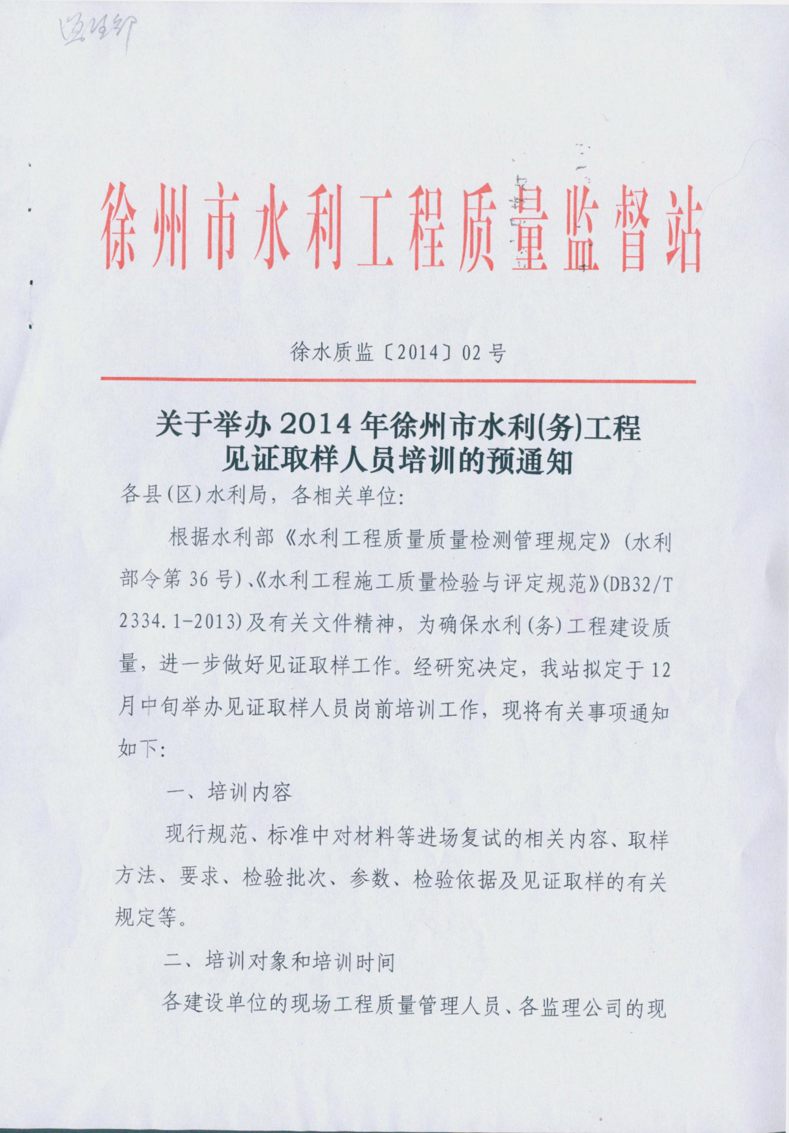1、《关于举办2014年徐州市水利(务)工程见证取样人员培训的预通知》
