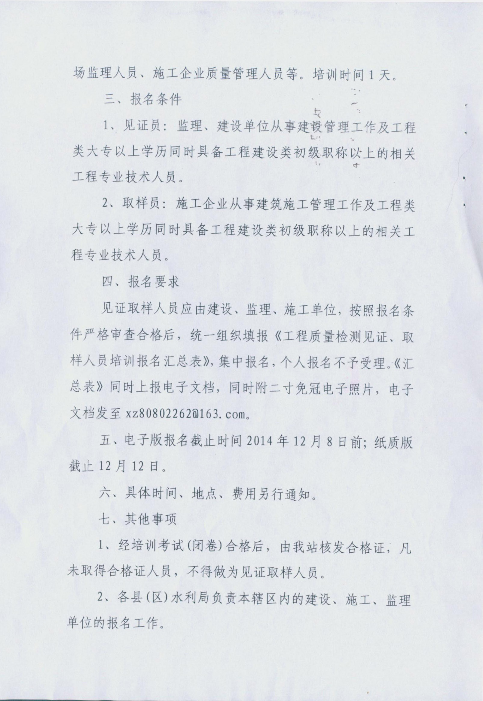 现将徐州市水利工程质量监督站《关于举办2014年徐州市水利(务)工程见证取样人员培训的预通知》转发给大家,请各个片区至少报名一人参加培训,于2014年12月7日前将“电子证件照片”和《见证取样人员培训班登记表》报至综合部。